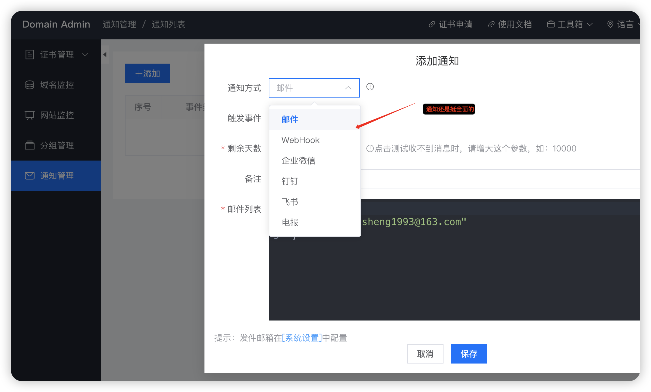 这个也是必不可少的,这个系统能给运维省不少事情,域名、ssl证书、证书申请、告警通知,这些都是实实在在需要面临的问题