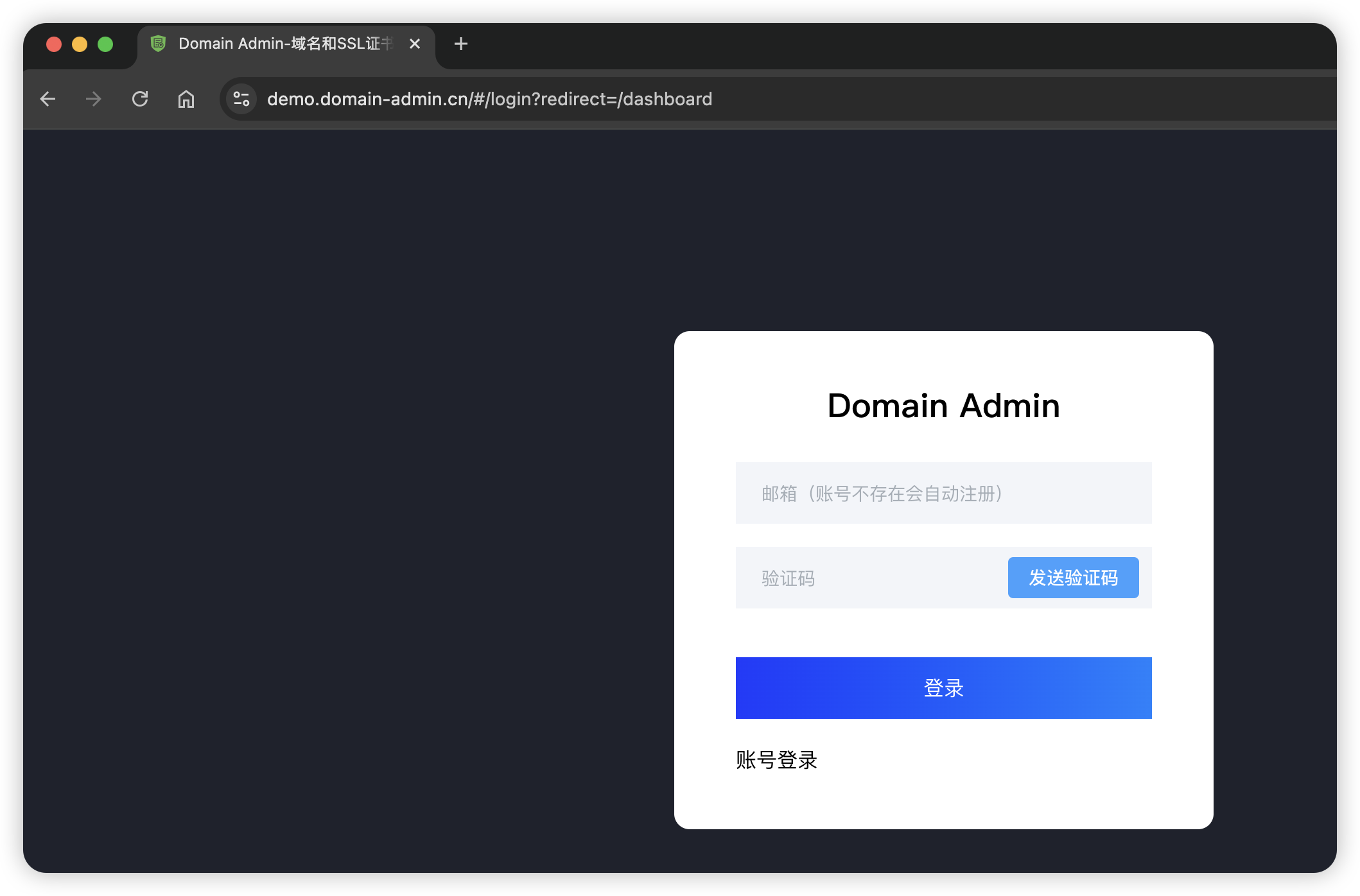 输入邮箱,收取一个验证码登录即可进入Domain Admin 管理后台
