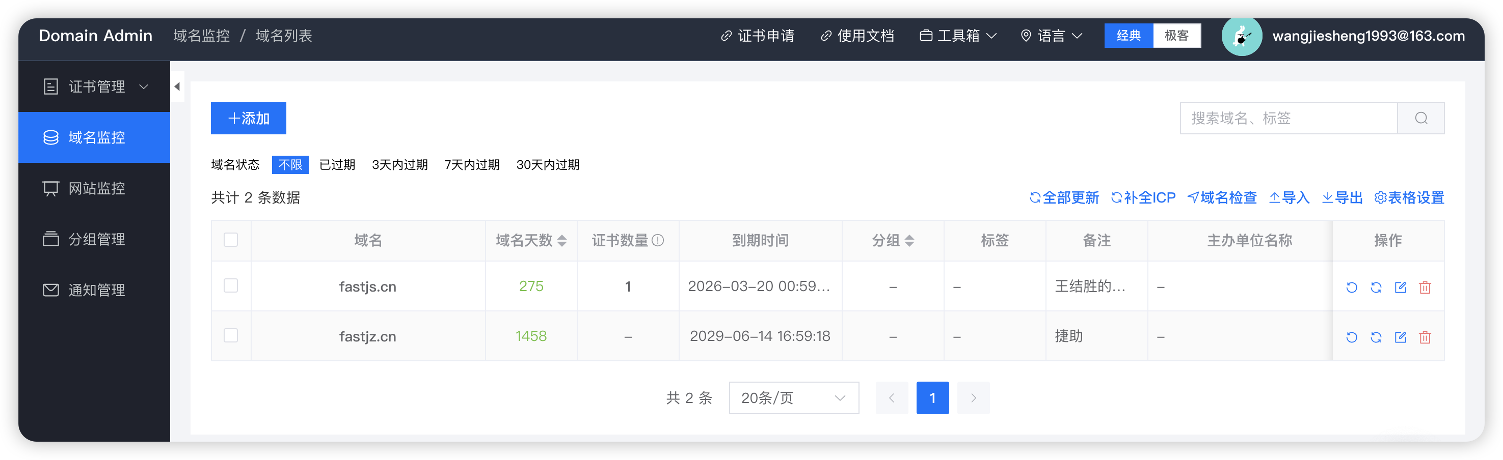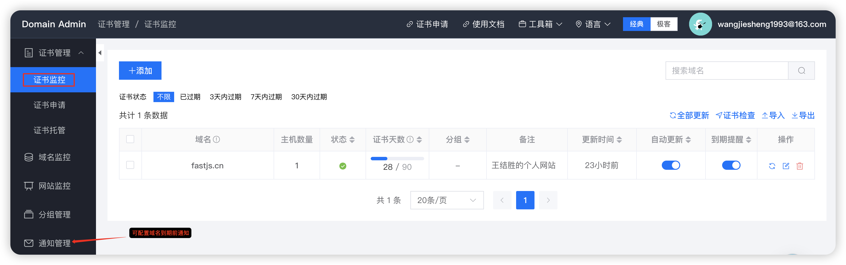 这个功能也是很直接哈,特别是公司下面有很多域名的时候,又是通过不同的服务商注册的,导致管理起来很麻烦,有了这个神器,就可以批量来管理了,一目了然